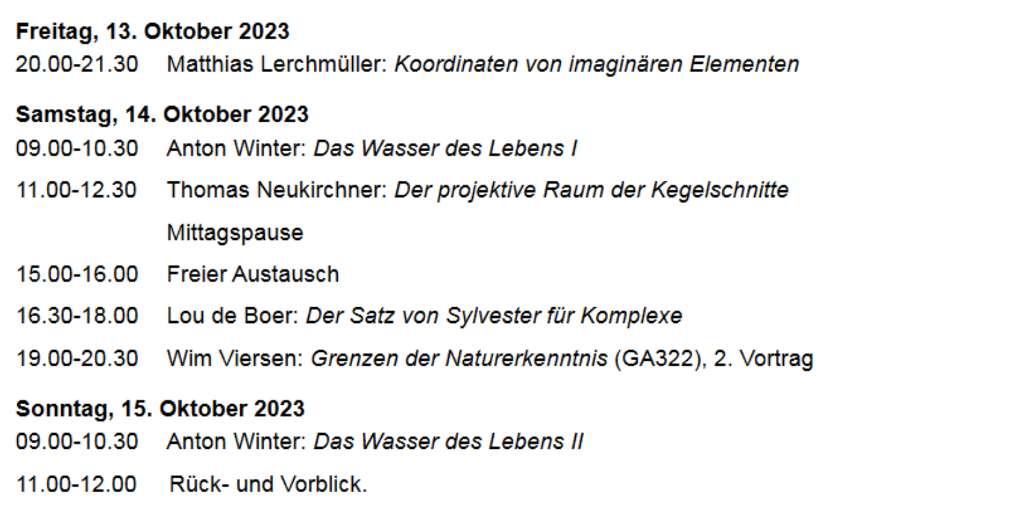seien Sie herzlich eingeladen zum 49. Treffen des Kolloquiums Mathematik und Geisteswissenschaft, welches vom 13. bis 15. Oktober 2023 am Goetheanum in Dornach stattfinden wird.